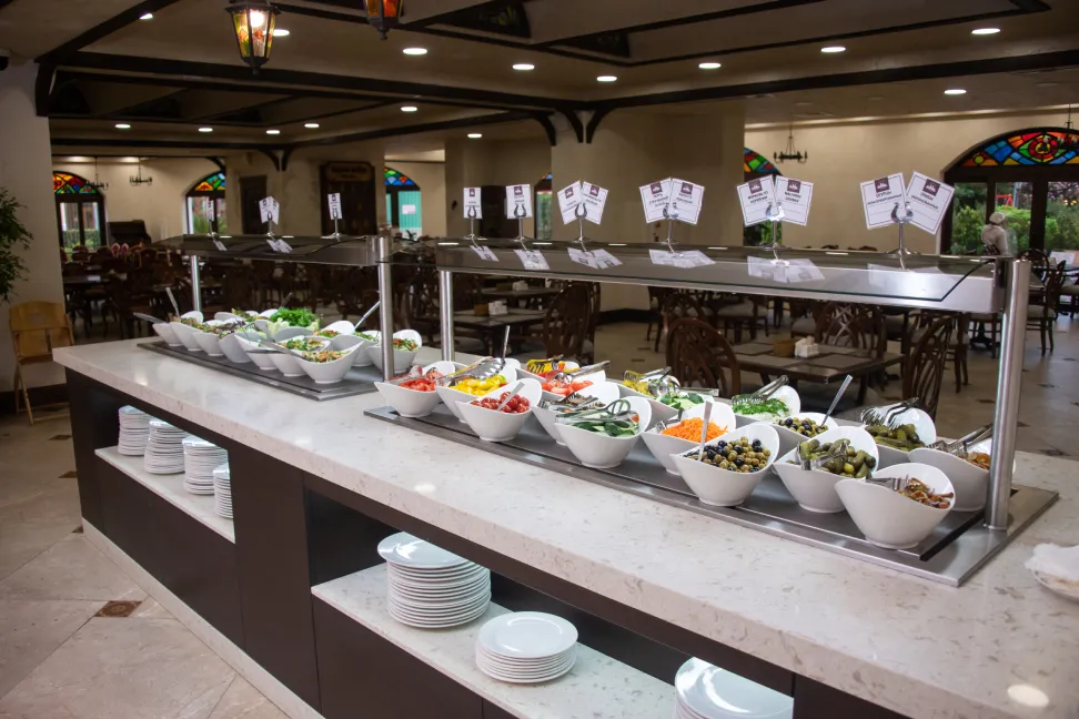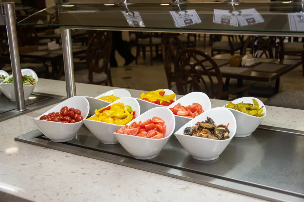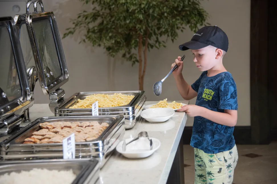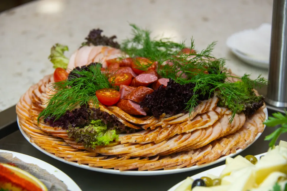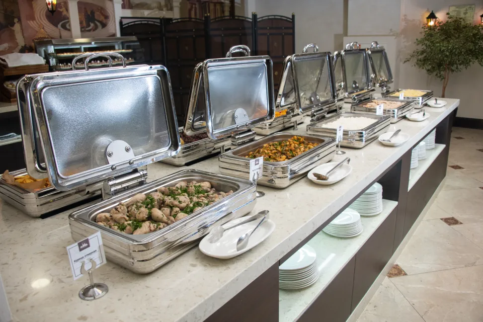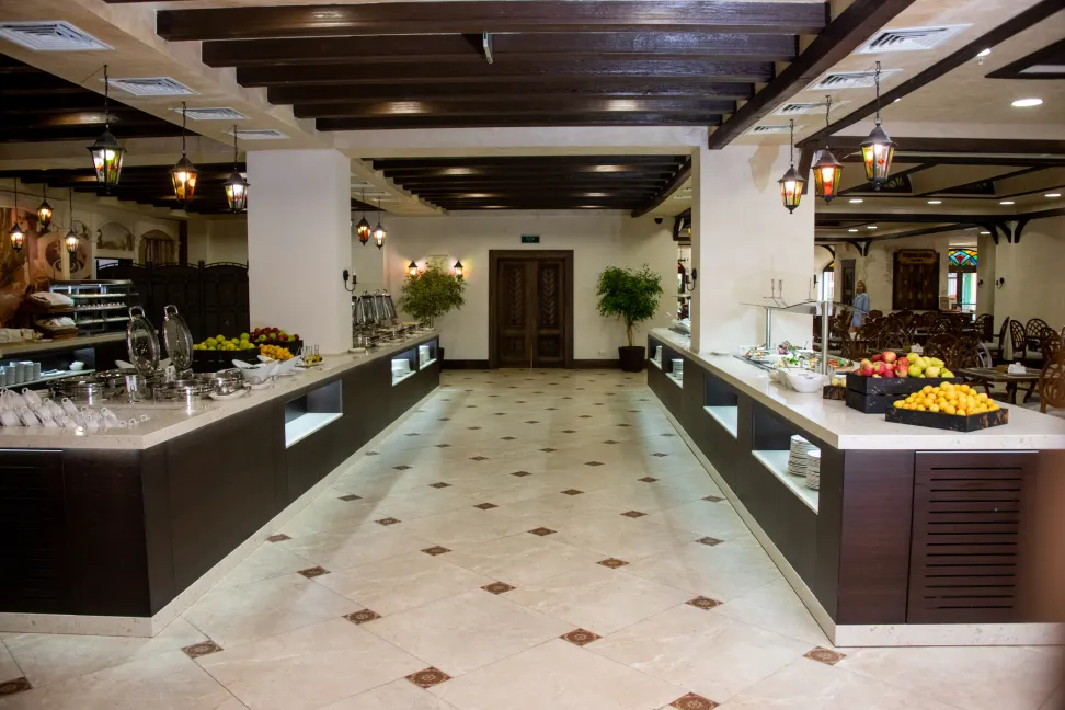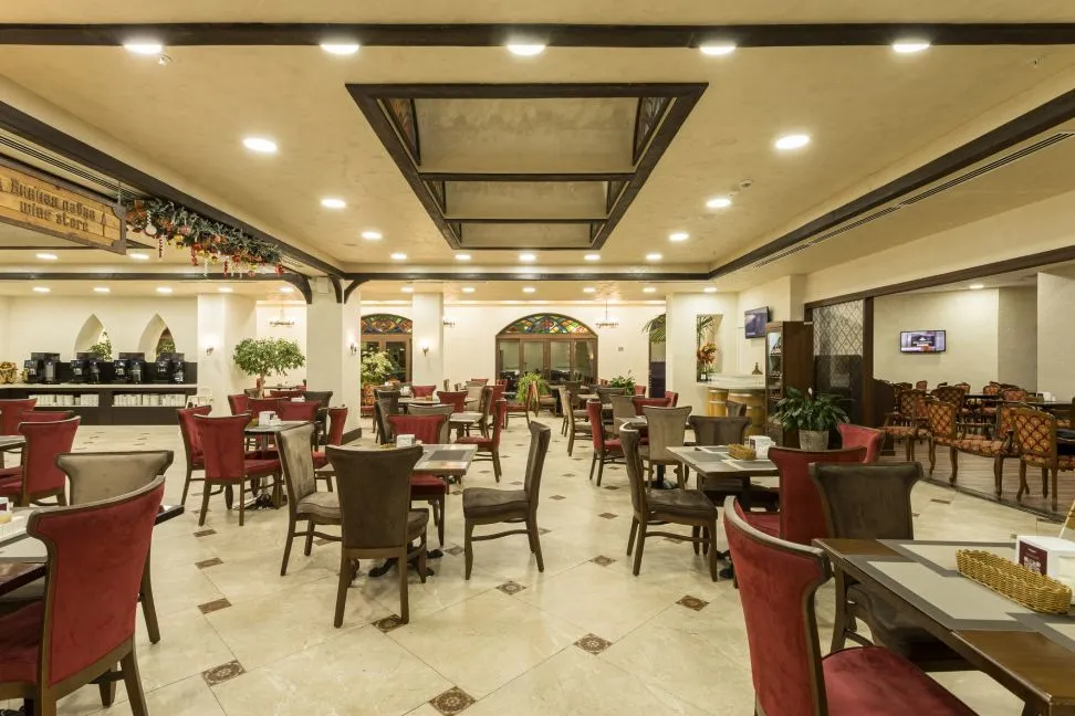 This is a cozy restaurant with medieval style interior: light walls, dark wood furniture and antique chandeliers, is located on minus first (first underground) floor of the hotel "Bogatyr". Delicious breakfasts, hearty lunches and fine dinners are served here in the buffet system. The breakfast menu includes all kinds of curds, yogurts, muesli, juices, cereals, crispy croissants, pancakes, waffles, desserts, fresh fruits, scrambled eggs and omelets. Soups and salads, a variety of meat and fish dishes, seafood, pastries and desserts are offered for lunch and for dinner in evenings. The hall is designed for 270 people.