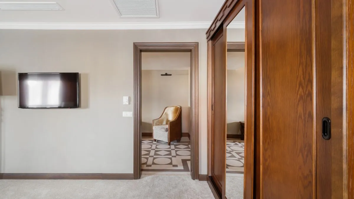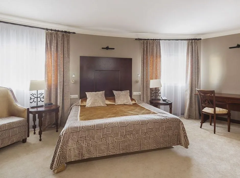 Просторный комфортабельный номер люкс площадью от 52,4 до 62,8 м2 с двумя комнатами (спальней и гостиной) и просторной гардеробной или шкафом. Интерьер люкса отличается сдержанностью и элегантностью, а цветовая гамма выдержана в благородных бежево-золотистых тонах. Одновременно в номере этой категории может проживать два человека, дополнительное место оплачивается отдельно.