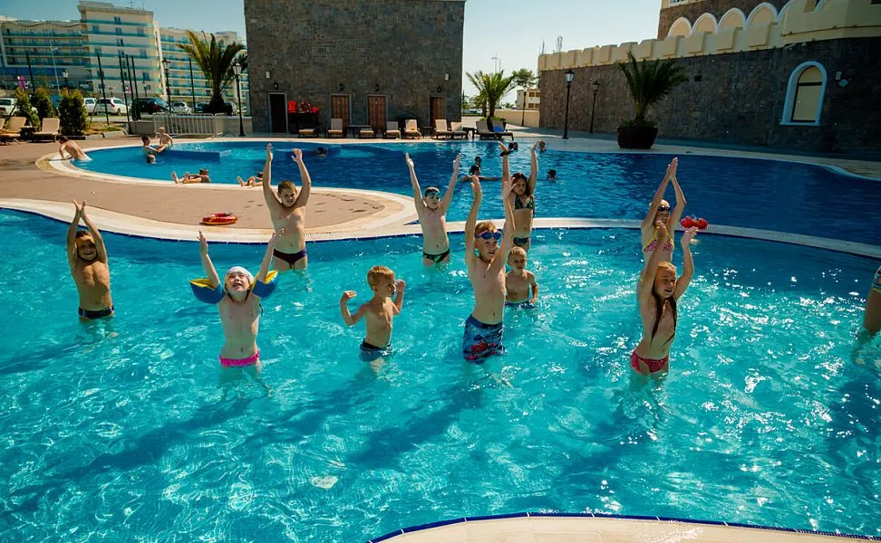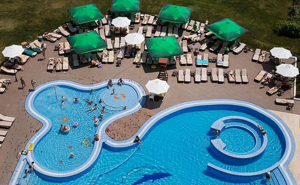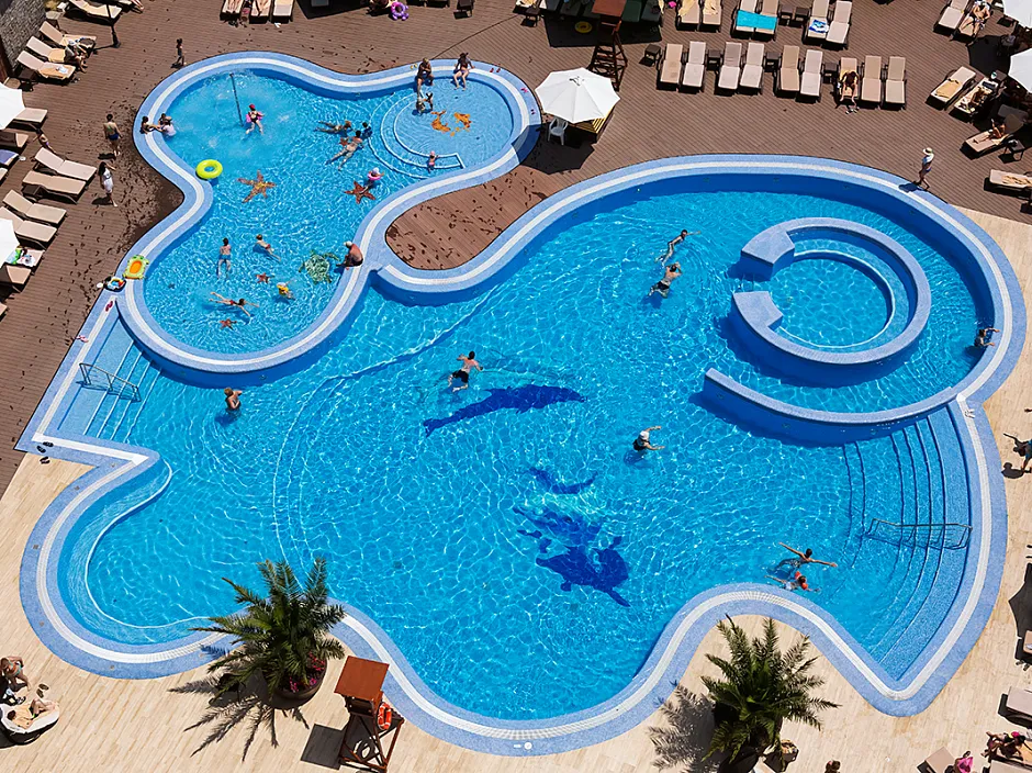 Даже если погода оставляет желать лучшего, у бассейна всегда много людей, ведь вода в нем подогревается до комфортной температуры. В детской зоне бассейна установлен фонтан-грибок.