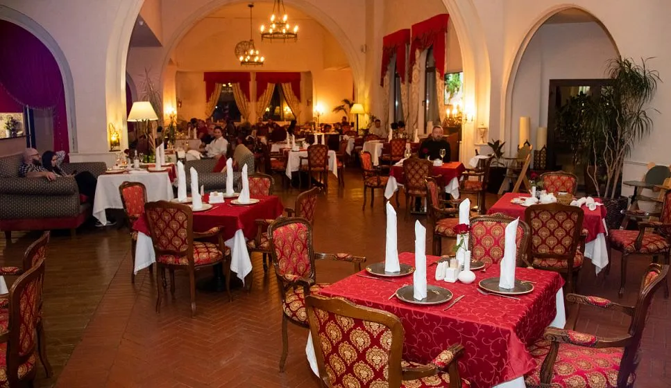 В уютном ресторане с интерьером в средневековом стиле накрывают аппетитные завтраки и ужины по системе «шведский стол»