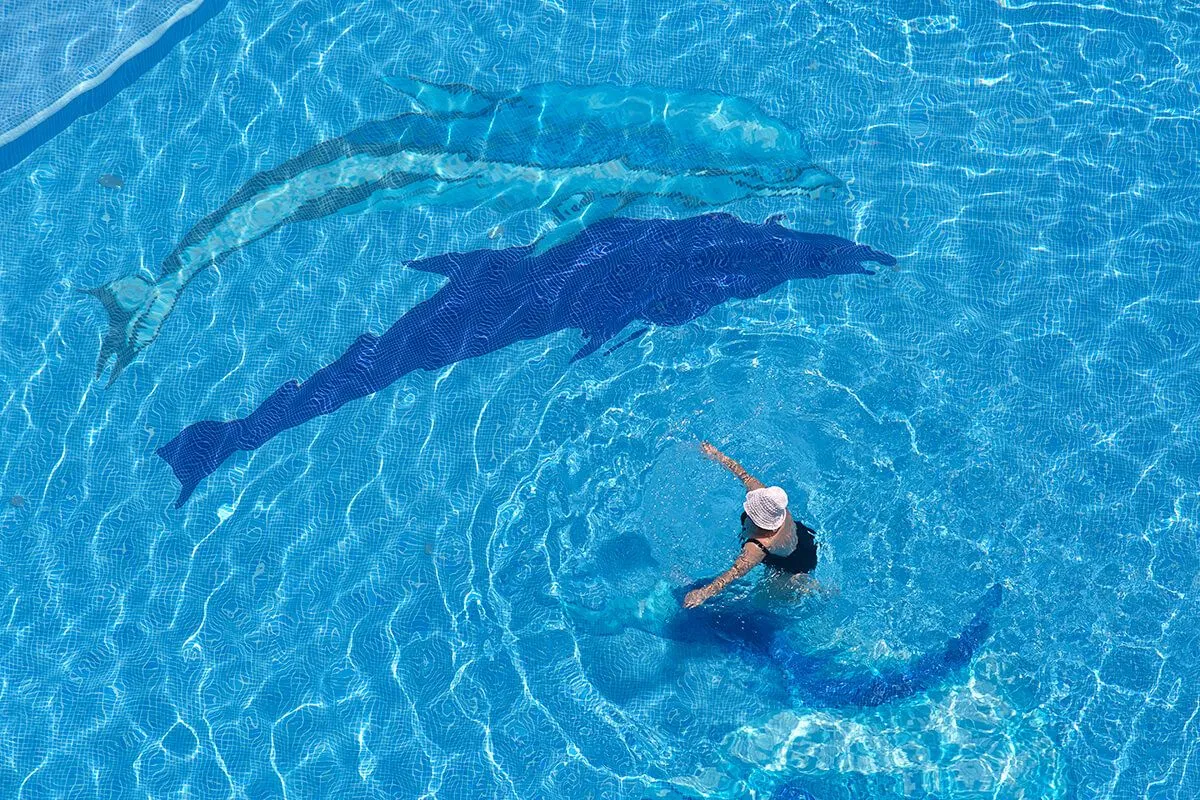 Даже если погода оставляет желать лучшего, у бассейна всегда много людей, ведь вода в нем подогревается до комфортной температуры. В детской зоне бассейна установлен фонтан-грибок.